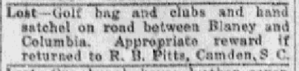 Lost – Golf bag and clubs and hand satchel on road between Blaney and Columbia. Appropriate reward if returned to R. B. Pitts, Camden, S. C.
