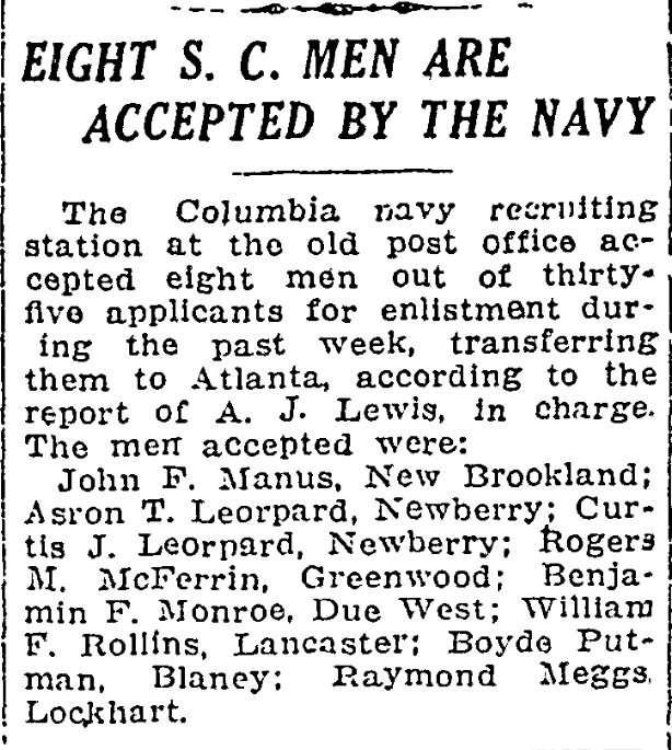 The Columbia navy recruiting station at the old post office accepted eight men out of thirty-five applicants for enlistments during the past week, transferring them to Atlanta, according to the report of A. J. Lewis, in charge. The Men accepted were: