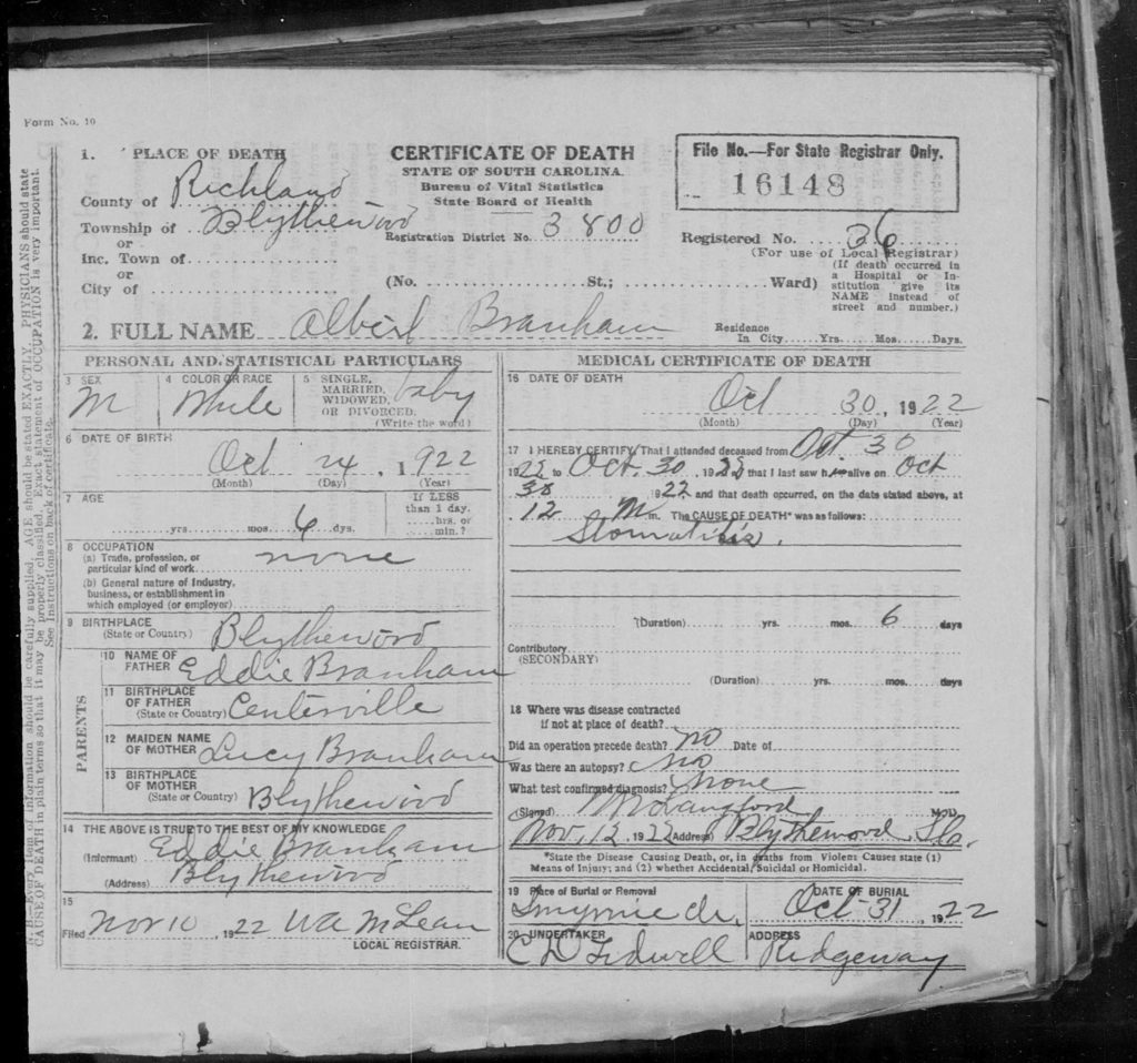 He died on 30 Oct 1922 in Blythewood, Richland, South Carolina, USA. Albert Branham was buried on 31 Oct 1922 in Elgin, Kershaw, South Carolina, USA at Smyrna United Methodist Church Cemetery. His cause of death was stomatitis.