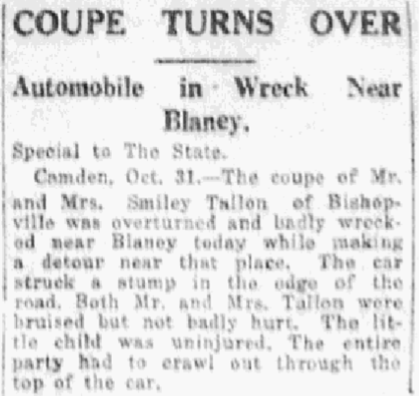 Automobile in Wreck Near Blaney. Special to The State. Camden, Oct. 31. – The coupe of Mr. and Mrs. Smiley Tallon of Bishopville was overturned and badly wrecked near Blaney today while making a detour near that place. The car struck a stump in the edge of the road. Both Mr. and Mrs. Tallon were bruised but not badly hurt. The little child was uninjured. … Continue reading Coupe Turns Over