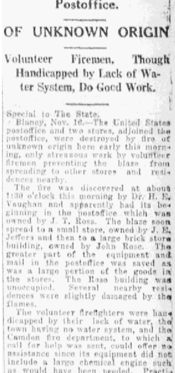 The fire was discovered at about 1:30 o’clock this morning by Dr. H. E. Vaughan and apparently had its beginning in the post office which was owned by J. T. Ross. The blaze soon spread to a small store, owned by J. E. Jeffers and then to a large brick store building, owned by John Rose. The greater part of the equipment and mail in the post office was saved as was a large portion of the goods in the stores. The Rose building was unoccupied. Several nearby residences were slightly damaged by the flames.