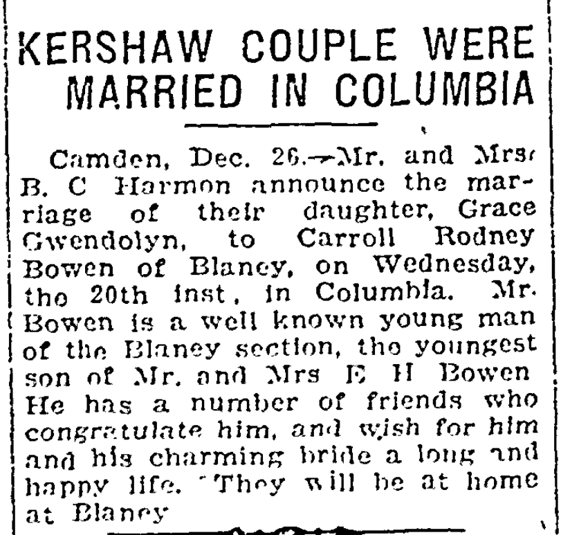 Camden, Dec. 26 – Mr. and Mrs. B. C. Harmon announce the marriage of their daughter, Grace Gwendolyn Harmon, to Carroll Rodney Bowen of Blaney, on Wednesday, the 20th inst, in Columbia. Mr. Bowen is a well known young man of the Blaney section, the youngest son of Mr. and Mrs. E. H. Bowen (Annie Bailey Bowen). He has a number of friends who congratulate … Continue reading Kershaw Couple Were Married In Columbia