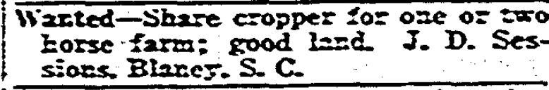 Wanted – Share cropper for one or two horse farm; good land. J. D. Sessions. Blaney, S. C. Continue reading Wanted – Male Help