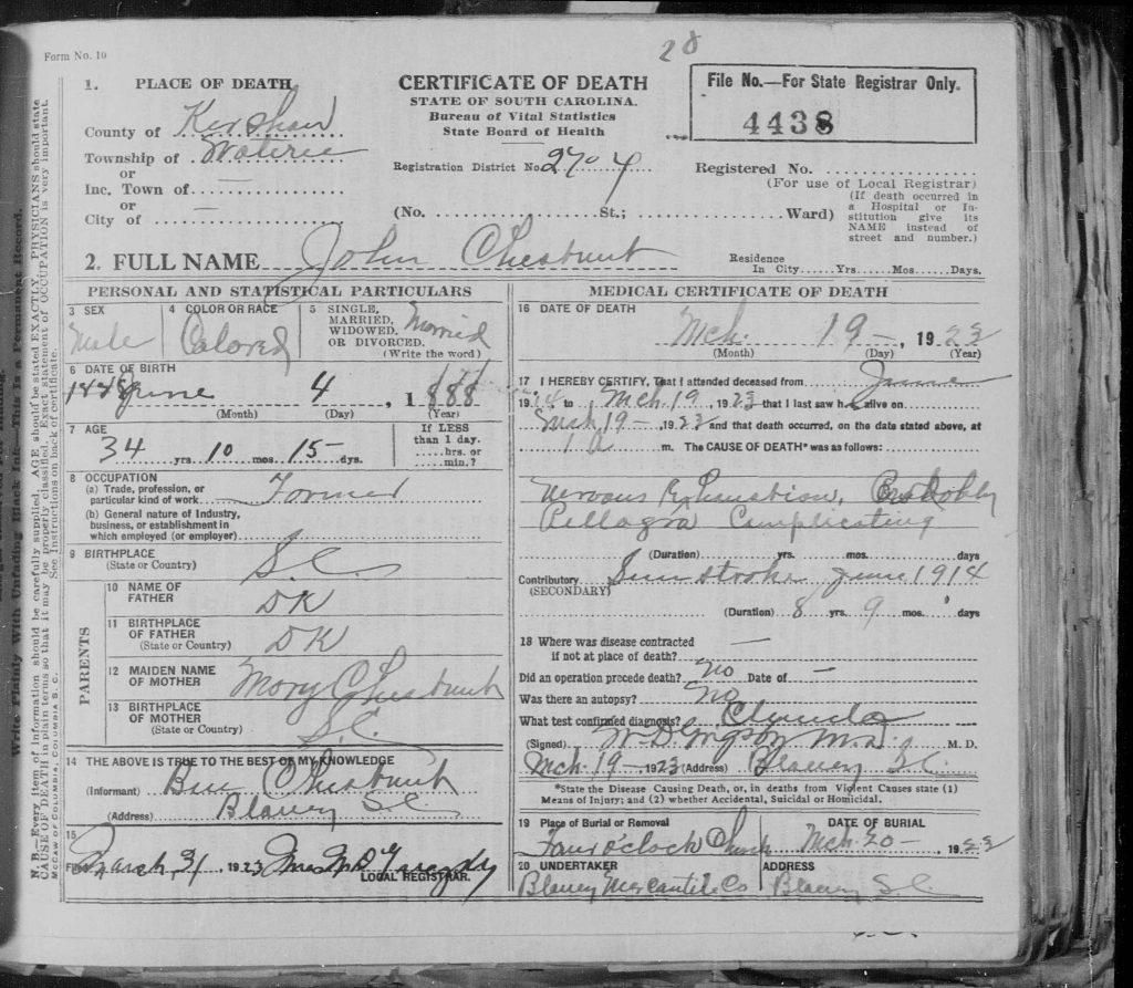 He died on 19 Mar 1923 in Wateree, Kershaw, South Carolina, USA. John Chestnut was buried on 20 Mar 1933 in Elgin, Kershaw, South Carolina, USA at Fort Clark Baptist Church Cemetery.