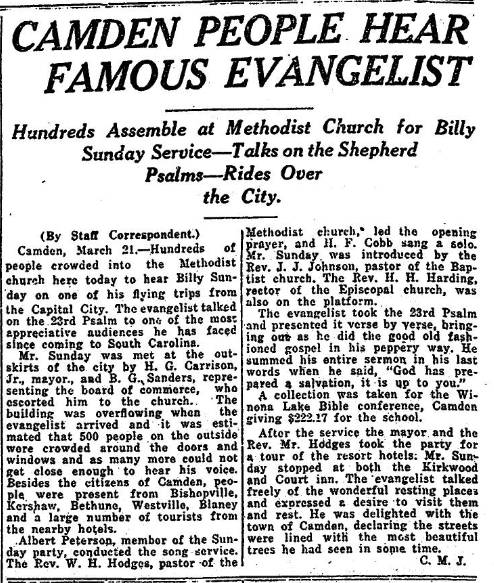 Camden, March 21. – Hundreds of people crowded into the Methodist church here today to hear Billy Sunday on one of his flying trips from the Capital City. The evangelist talked on the 23rd Psalm to one of the most appreciative audiences he has faced since coming to South Carolina.