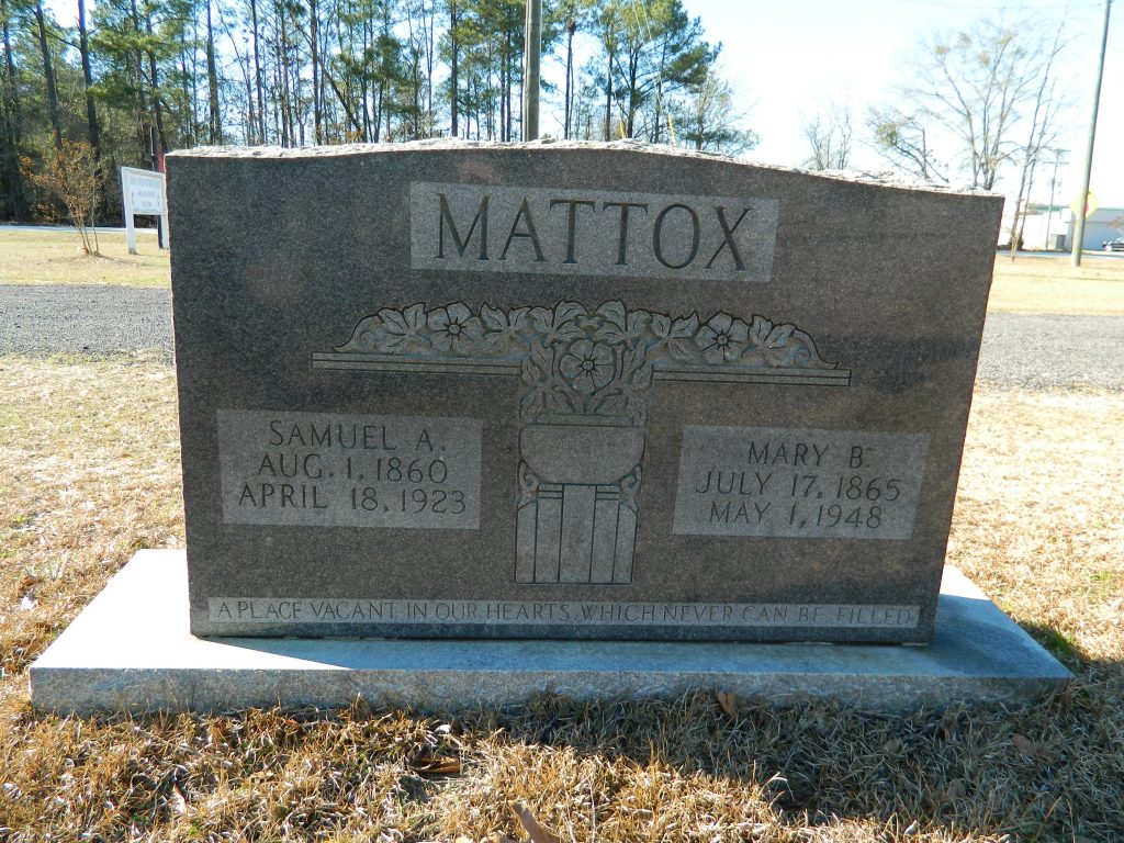 On December 26, 1973, Samuel A Mattox was mentioned as the deceased father on the death record of Mrs Annie Mattox Fulmer.