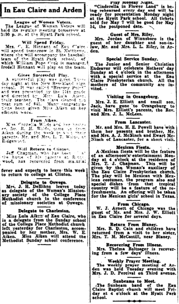 Mrs. C. E. Hinnant of Eau Claire will spend tomorrow in St. Matthews, where she will accompany the baseball team of the Hyatt Park school, of which William Pope Cook is manager. Iredell Hinnant will play on the team.