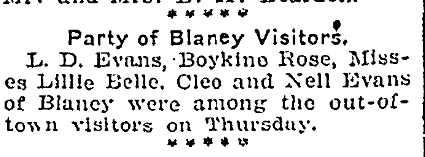 L. D. Evans, Boykine Rose, Misses Lillie Belle Evans, Cleo Evans and Nell Evans of Blaney were among the out-of-town visitors on Thursday.