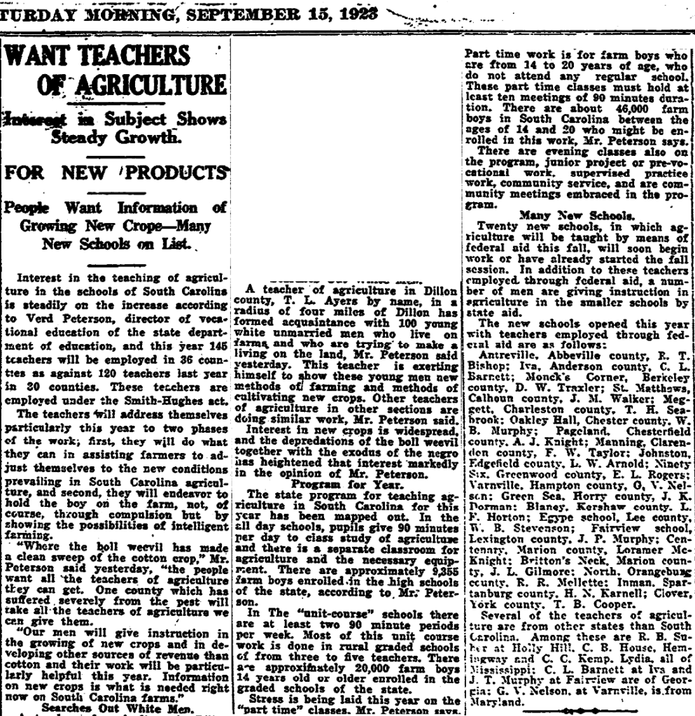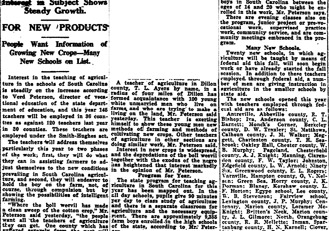 A teacher of agriculture in Dillon County, T. L. Ayers by name, in a radius of four miles of Dillon has formed acquaintance with 100 white unmarried men who live on farms and who are trying to make a living on the land, Mr. Peterson said yesterday. This teacher is exerting himself to show these young men new methods of farming and methods of cultivating new crops. Other teachers of agriculture in other sections are doing similar work, Mr. Peterson said.