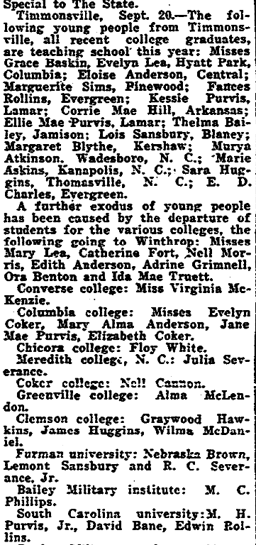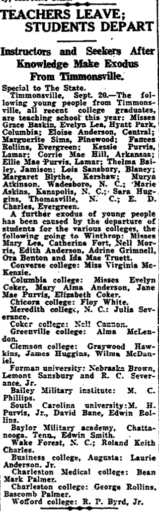 Timmonsville, Sept. 20 – The following young people from Timmonsville, all recent college graduates, are teaching school this year; Misses Grace Baskin, Evelyn Lea, Hyatt Park, Columbia; Eloise Anderson, Central; Marguerite Sims, Pinewood; Fances Rollins, Evergreen; Kessie Purvis, Lamar; Corrie Mae Hill, Arkansas; Ellie Mae Purvis, Lamar; Thelma Bailey, Jamison; Lois Sansbury, Blaney; Margaret Blythe, Kershaw; Murya Atkinson, Wadesboro, N. C.; Marie Askins, Kanapolis, N. C.; Sara Huggins, Thomasville, N. C.; E. D. Charles, Evergreen.