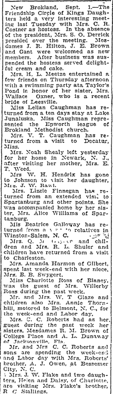 New Brookland, Sept. 1. – The Friendship Circle of Kings Daughters held a very interesting meeting last Tuesday with Mrs. C. R. Costner as hostess. In the absence of the president, Mrs. S. O. Derrick presided over the meeting. Mesdames J. R. Hilton, J. E. Brown and Gant were welcomed as new members. After business was suspended the hostess served delightful cream and cake. Mrs. … Continue reading New Brookland