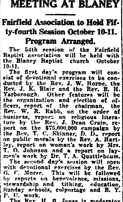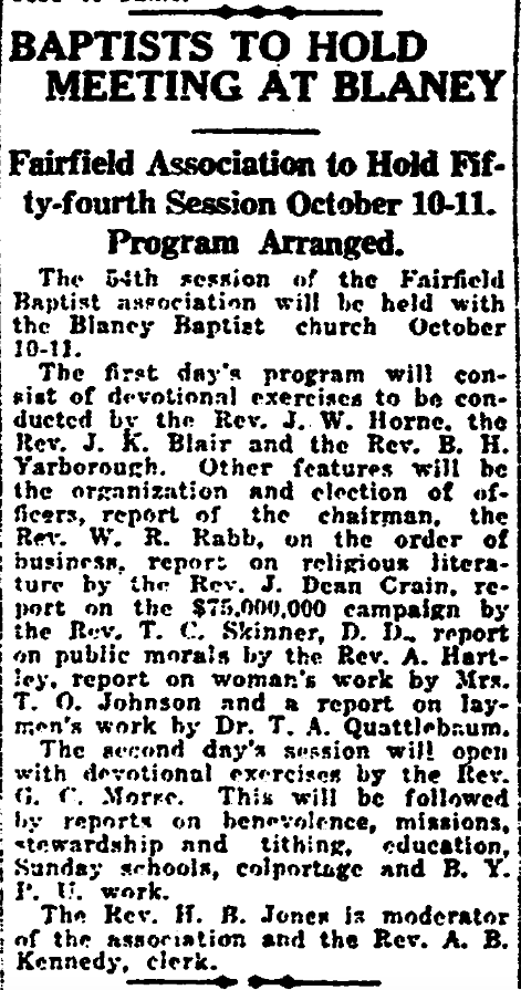The 54th session of the Fairfield baptist association will be held with the Blaney Baptist church October 10-11.