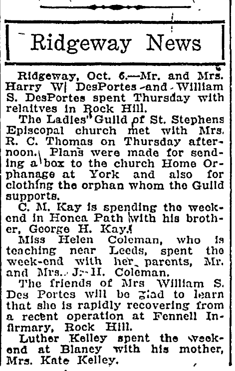 Ridgeway, October 6, – Mr. and Mrs. Harry W. DesPortes and William S. DesPortes spent Thursday with relatives in Rock Hill.