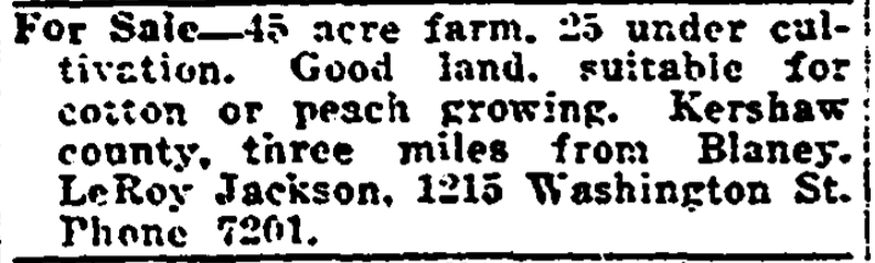 For Sale – 45 acre farm, 25 under cultivation. Good land, suitable for cotton or peach growing. Kershaw County, three miles from Blaney. LeRoy Jackson, 1215 Washington St. Phone 7201.