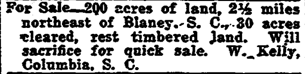 For Sale – 200 Acres of land 2 1/2 miles northeast of Blaney, S. C., 30 acres cleared, rest timbered land. Will sacrificed for quick sale. W. Kelly, Columbia, S. C.