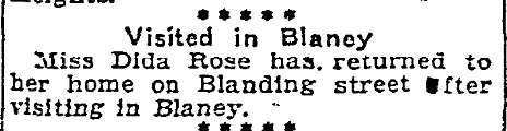 Today in HistoryVisited in Blaney Miss Dida Rose has returned to her home on Blanding street after visiting Blaney. January 6, 1924 Columbia Record (published as The Sunday Record) Columbia, South CarolinaPage 10