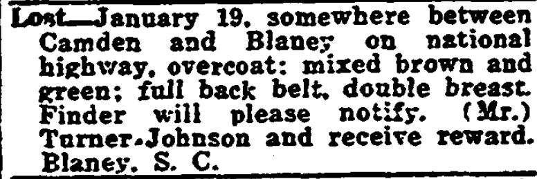 Lost – January 19, somewhere between Camden and Blaney on national highway, overcoat; mixed brown and green; full back belt, double breast. Finder will please notify, (Mr.) Turner Johnson and receive reward. Blaney, S. C.
