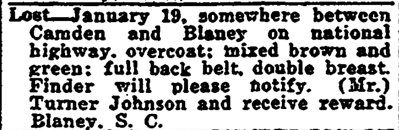 Lost – January 19, somewhere between Camden and Blaney on national highway, overcoat; mixed brown and green; full back belt, double breast. Finder will please notify, (Mr.) Turner Johnson and receive reward. Blaney, S. C.