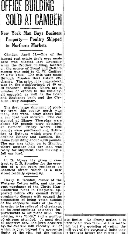 Camden, April 21. – One of the largest real estate deals ever made here was effected last Thursday when the Crocker, building, located on the corner of Broad and DeKalb street was sold to C. W. Godfrey of New York. The sale was made through Camden Real Estate exchange. The sale was made through Camden Real Estate exchange. The price, it is understood, was in the neighborhood of 40 or 50 thousand dollars. There are a number of office in the building, all occupied, as well as the Loan and Exchange bank and the Clyburn Drug company.