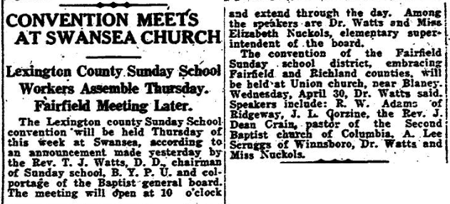 The convention of the Fairfield Sunday school district, embracing Fairfield and Richland counties, will be held at Union church, near Blaney. Wednesday, April 30, Dr. Watts said. Speakers include: R. W. Adams of Ridgeway, J. L. Gorzine, the Rev. J. Dean Crain, pastor of the Second Baptist church of Columbia, A. Lee Scruggs of Winnsboro, Dr. Watts, and Miss Nuckols.