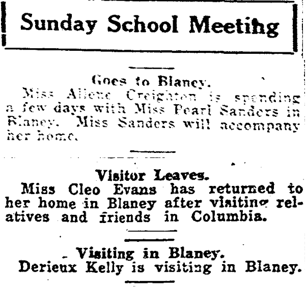 Miss Allene Creighton is spending a few days with Miss Pearl Sanders in Blaney. Miss Sanders will accompany her home.