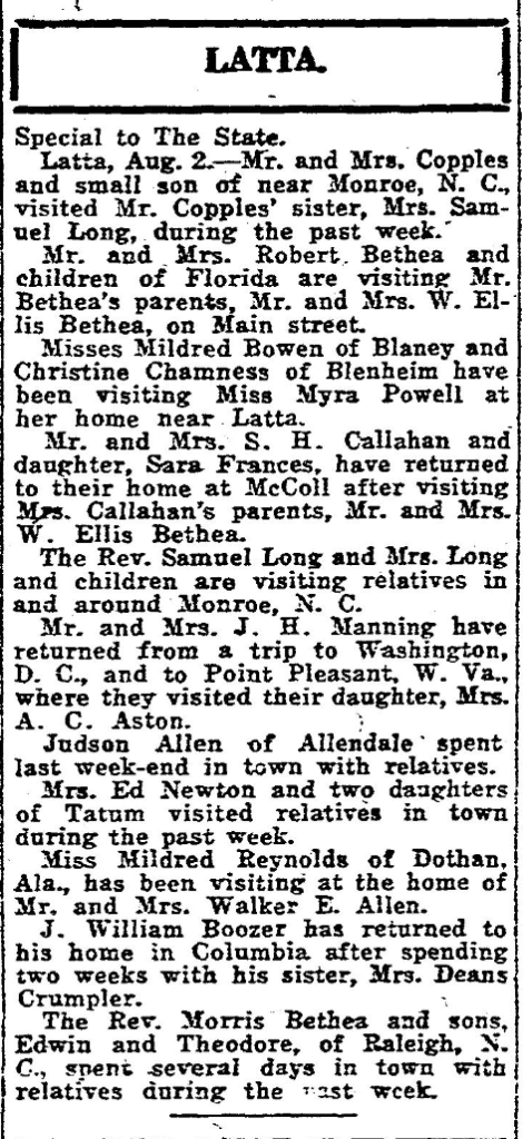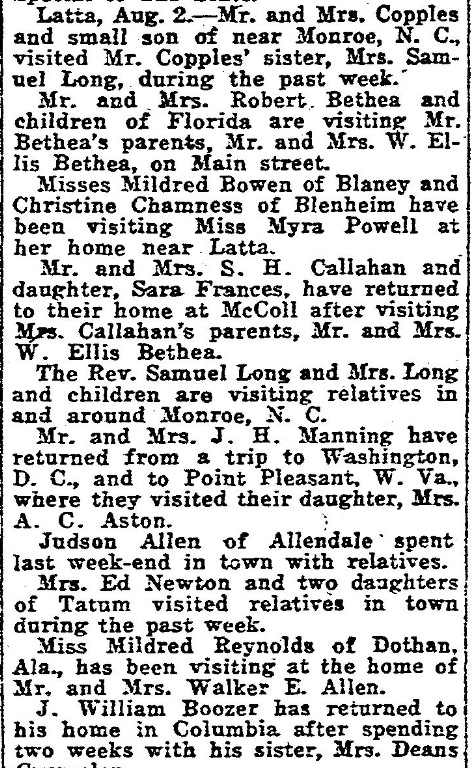 Latta, August 2, – Mr and Mrs. Copples, and small son of near Monroe, N. C. , visited Mr. Copples’ sister, Mrs. Samuel Long, during the past week.