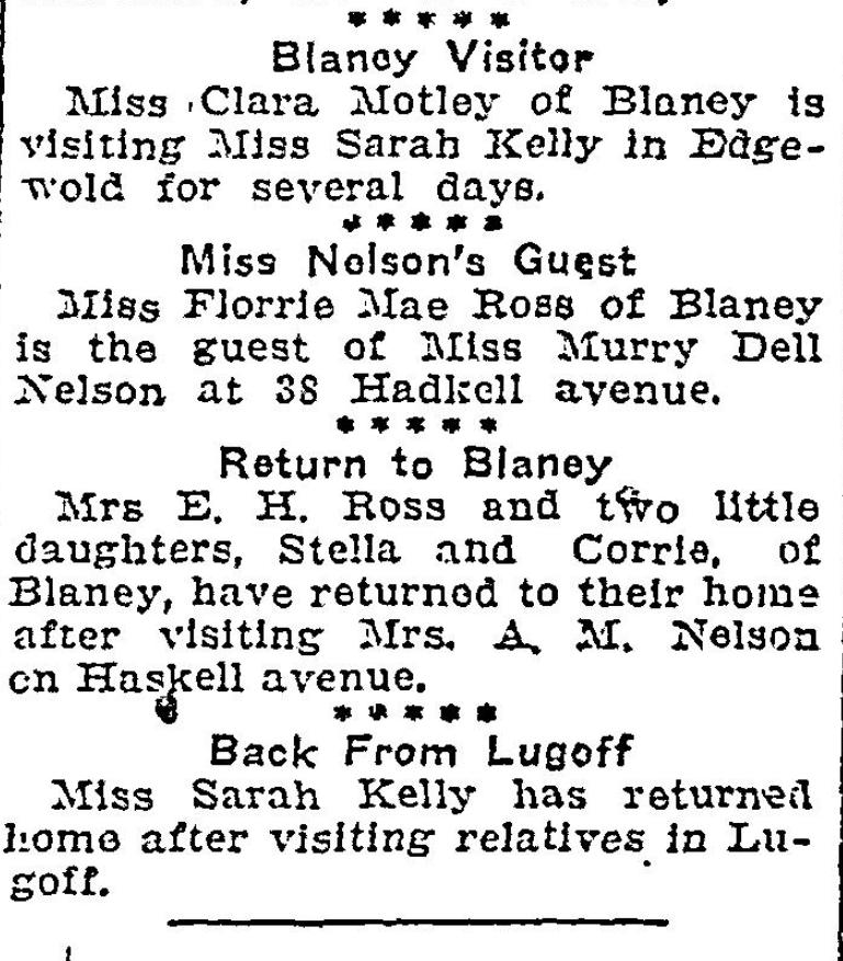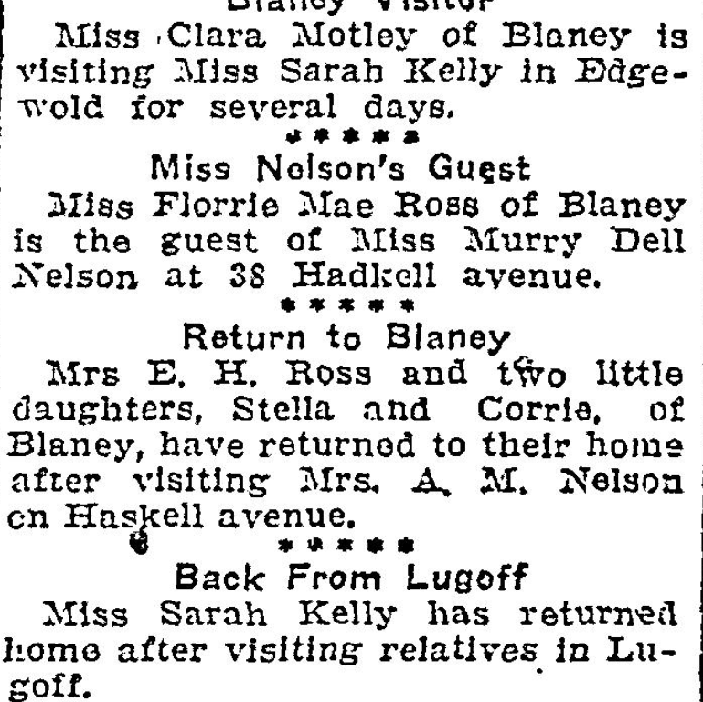 Mrs. E. H. Ross and two little daughter, Stella Ross and Corrie Ross, of Blaney, have returned to their home after visiting Mrs. A. M. Nelson on Haskell Ave