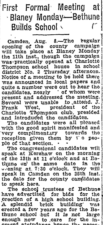 First Formal Meeting at Blaney Monday – Bethune Builds School Camden, Aug. 8 – The regular opening of the county campaign will take place a t Blaney Monday the 11th inst., through the campaign was practically opened at Charlotte Thompson school house in school district No. 2 Thursday afternoon. Notice of a meeting to be held there was announced in local papers and quite a … Continue reading Kershaw County Campaign Opens