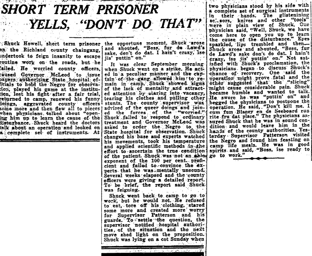 Shuck Howell, short term prisoner on the Richland county chain gang, undertook to feign insanity to escape routine work on the roads, but he failed. He worried county officers, caused Governor McLeod to issue papers authorizing State hospital officials to hold the Negro for observation, played his game at the institution, lost his fight after a fair trail, returned to camp, renewed his funny doings, aggravated county officers some more and then flew all to pieces when physicians talked about “opening him up to learn the cause of the disturbance. Shuck heard the doctors talk about an operation and looked on a complete set of instruments. At The opportune moment, Shuck arose and shouted, “Boss, fur de Lawd’s sake, don’t do dat. I hain’t crazy, ise jis’ puttin’on.”