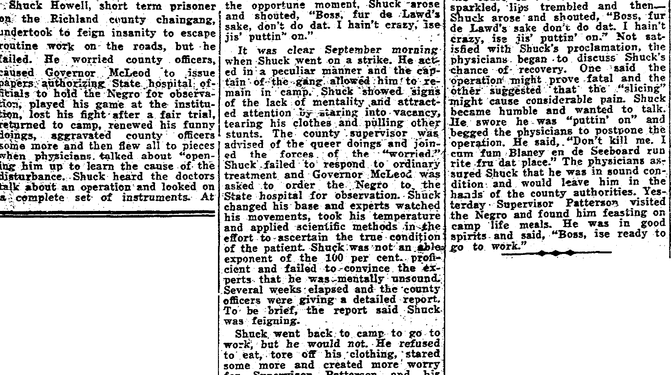 Shuck Howell, short term prisoner on the Richland county chain gang, undertook to feign insanity to escape routine work on the roads, but he failed. He worried county officers, caused Governor McLeod to issue papers authorizing State hospital officials to hold the Negro for observation, played his game at the institution, lost his fight after a fair trail, returned to camp, renewed his funny doings, aggravated county officers some more and then flew all to pieces when physicians talked about “opening him up to learn the cause of the disturbance. Shuck heard the doctors talk about an operation and looked on a complete set of instruments. At The opportune moment, Shuck arose and shouted, “Boss, fur de Lawd’s sake, don’t do dat. I hain’t crazy, ise jis’ puttin’on.”