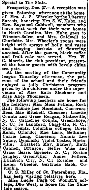 Prosperity, Dec 27. – A reception was given Saturday afternoon a the home of Mrs. J. S. Wheeler by the Literary Sorosis, Honoring, Mrs. S. W. Hahn ad Mrs. Raymond Caldwell members who leave next week for their new homes in North Carolina. Mrs. Hahn goes to Winston-Salem and Mrs. Caldwell to Charlotte. Mrs. Wheeler’s rooms were bright with sprays of holly and vases and hanging baskets fo flowering narcissi. After the games, black coffee and fruit cake was served. Mrs. W. C. Morris, the club president, present the honor guests with lovely china tea pots.