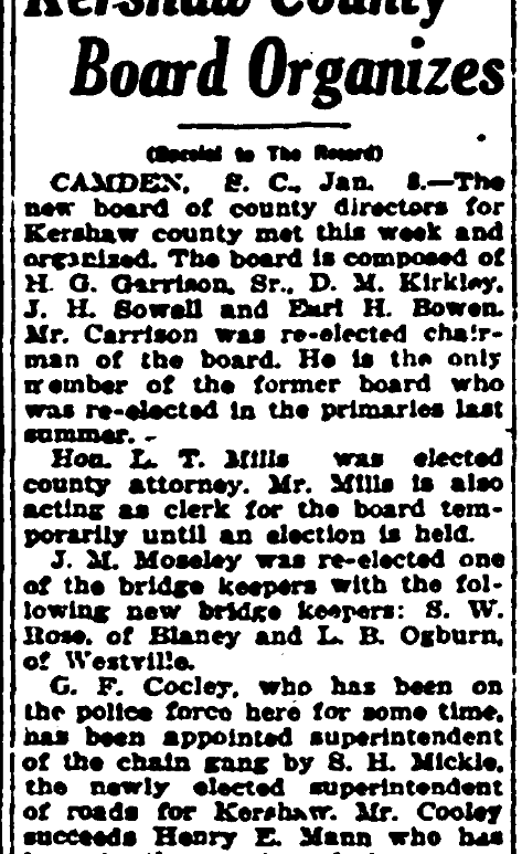 (Special to The Record) CAMDEN, S. C., Jan. 8 – The new board of county directors for Kershaw county met this week and organized. The board is composed of H. G. Garrison, Sr., D. M. Kirkley, J. H. Sowell and Earl H. Bowen, Mr. Garrison was re-elected chairman of the board. He is the only member of the former board who was re-elected in the … Continue reading Kershaw County Board Organizes
