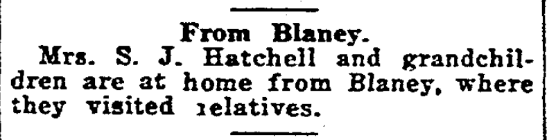 Mrs. S. J. Hatchell and grandchildren are at home from Blaney, where they visited relatives. Continue reading From Blaney