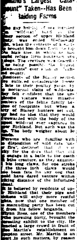 Richland’s Largest “Catamount” Taken – Has Been Raiding Farms. They say holding of one member is “wild-cat” (?) in the Blaney section of upper Richland County, was ended Wednesday night, when the contents of a (?) brought him down from the (?) high tree in which he had sought refuge from huntsmen and dogs. The creature was (?) as being possibly the largest dismounts ever … Continue reading Large Wildcat Killed At Blaney