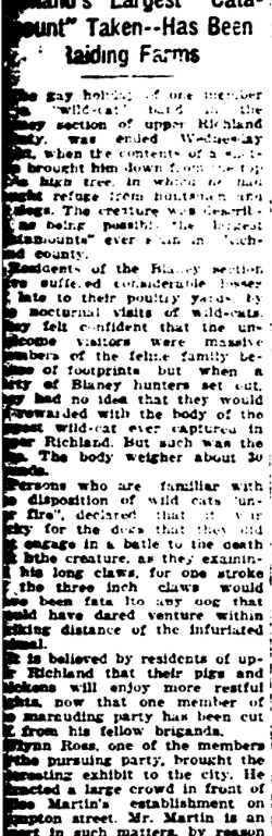 Residents of the Blaney secti on have suffered considerable losses to date to their poultry yards by the nocturnal visits of wild-cats. (?) felt confident that the unwelcome visitors were massive member of the feline family because of the footprints but when a party of Balney hunters set out, they had no ideal that they would be rewarded with the body of the largest wild cat ever captured in upper Richland. But each was the (?) The body weighed about 30 pounds.