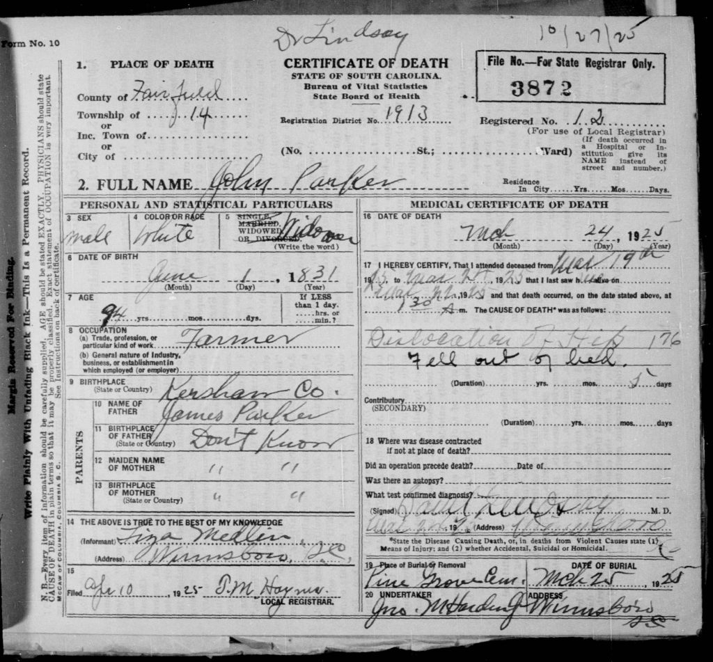 He died on 24 Mar 1925 in Fairfield, South Carolina, USA. He was buried on 25 Mar 1925 in Lugoff, Kershaw, South Carolina, USA at Pine Grove Baptist Church Cemetery. His cause of death was dislocated his hip when he fell out of bed.