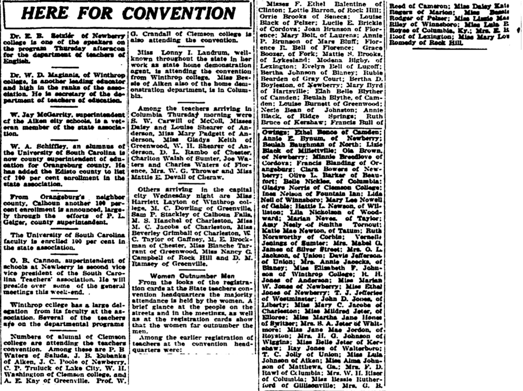 Among the teachers arriving in Columbia Thursday morning were S. W. Carwill of McColl, Misses Daisy and Louise Shearer of Anderson, Miss Mary Padgett of Anderson, Miss Gladys Keith of Greenwood, W. H. Shearer of Anderson, D. L. Rambo of Chester, Charlton Walsh of Sumter, Joe Waters and Charles Waters of Florence, Mrs. W. G. Thrower and Miss Mattie E. Devall of Cheraw.