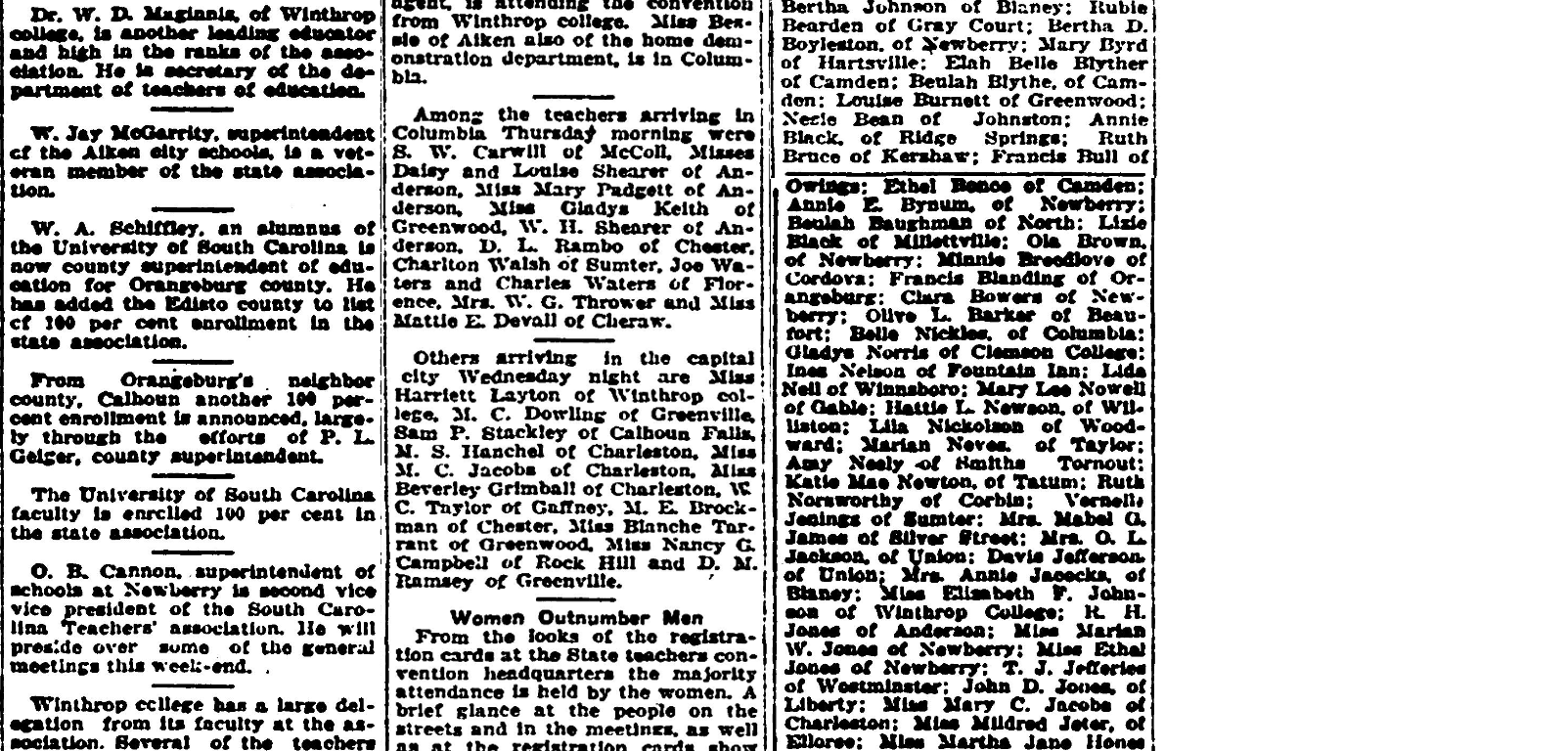 Misses F. Ethel Balentine of Clinton: Lottie Barron, of Rock Hill: Orrie Brooks of Seneca; Louise Black of Pelzer; Lucile E. Brickle of Cordova; Joan Brunson of Florence R. Bell of Florence; Grace Boozer, of Fork; Mattie S. Brooks, of Lykesland; Modena Bigby, of Lexington; Evelyn Bell of Lugoff; Bertha Johnson of Blaney; Rubie Bearden of Gray Court; Bertha D. Boyleston of Newberry; Mary Byrd of Hartsville; Elah Belle Blyther of Camden; Beulah Blythe, of Camden; Louise Burnett of Greenwood; Nesie Bean of Johnston; Annie Black, of Ridge Springs; Ruth Bruce of Kershaw; Francis Bull of Owings; Ethel Rence of Camden; Annie E. Bynum, of Newberry; Beulah Baughman of North; Lizie Black of Millettville; Ola Brown, of Newberry; Minnie Breedlove of Cordova; Francis Blanding of Orangeburg; Clara Bowers of Beaufort; Belle Nickles of Columbia; Gladys Norris of Clemson College; Ines Nelson of Fountain Inn; Lida Nell of Winnsboro; Mary Lee Nowell of Gable; Hattie L. Newson, of Williston: Lila Nickolson of Woodward; Marian Neves of Taylor; Amy Neely of Smiths Tornout; Katie Mae Newton of Tatum; Ruth Norsworthy of Corbin; Vernell Jenings of Sumter; Mrs. Mabel G. James of Silver Street; Mrs. O. L. Jackson, of Union; Davis Jefferson, of Union; Mrs. Annie Jacksons, of Blaney; Miss Elizabeth F. Johnson of Winthrop College; R. H. Jones of Anderson; Miss Marian W. Jones of Newberry; T. J. Jefferies of Westminster; John D. Jones, of Liberty; Miss Mary C. Jacobs of Charleston; Miss Mildred Jeter, of Elloree; Miss Martha Jane Honea of Switzer; Mrs. S. A. Jeter of Whitmore; Miss Jane Mae Jordon, of Boyston; Mrs. H. G. Johnson of Wiggins; Miss Belle Jeter of Kershaw; Ray Jones of Walterboro; T. C. Jolly of Union; Miss Lula Johnson of Aiken; Miss Alma Johnson of Matthews, Ga.; Mrs. F. D. Rawl of Columbia; Mrs. W. H. Riser of Columbia; Miss Bessie Rutherford of Gillisonville; Mrs. G. B. Reed of Cameron; Miss Daisy Kate Rogers of Marion; Miss Bonnie Roger of Pelzer; Miss Lizzie Mae Riley of Winnsboro; Miss Lula B. Boyse of Columbia, Ky.; Mrs. E. B. Roof of Lexington; Miss Mary Lou Romedy of Rock Hill.