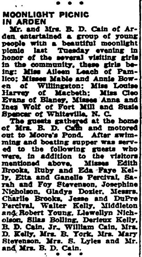 Mr. and Mrs. B. D. Cain of Arden entertained a group of young people with a beautiful moonlight picnic last Tuesday evening in honor of the several visiting girls in the community, these girls being: