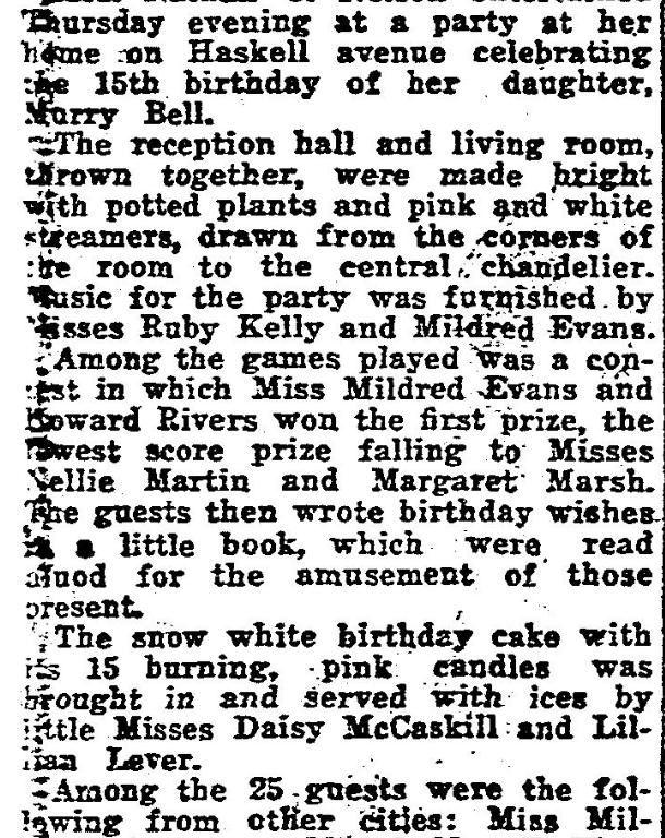 Among the 25 guests were the following from other cities: Miss Mildred Fleming of Miami, Mrs. T. Watson and little daughter of Spartanburg, and Misses Mildren Evans and Clara Motley of Blaney.