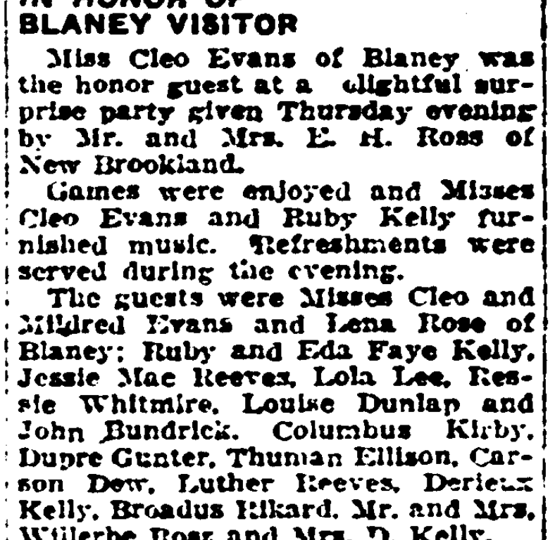The guest were Misses Cleo Evans and Mildred Evans and Lena Rose of Blaney; Ruby Kelly and Eda Faye Kelly, Jessie Mae Reeves, Lola Lee, Bessie Whitmire, Louise Dunlap and John Bundrick, Columbus Kirby, Dupre Gunter, Thuman Ellison, Carson Dew, Luther Reeves, Derieux Kelly, Broadus Rikard, Mr. and Mrs. Willerbe Rose and Mrs. D. Kelly.