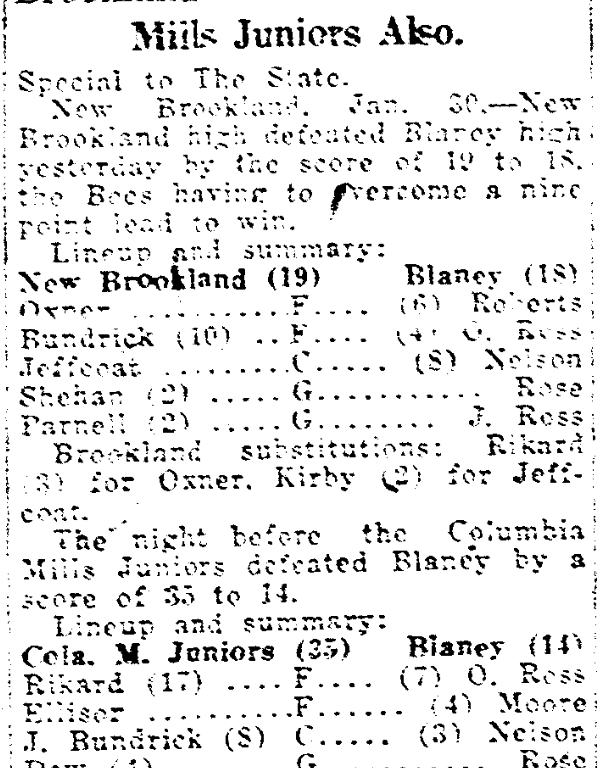 New Brookland, Jan. 30. – New Brookland high defeated Balney high yesterday by the score of 19 to 18 , the Bees having to overcome a nine point lead to win.