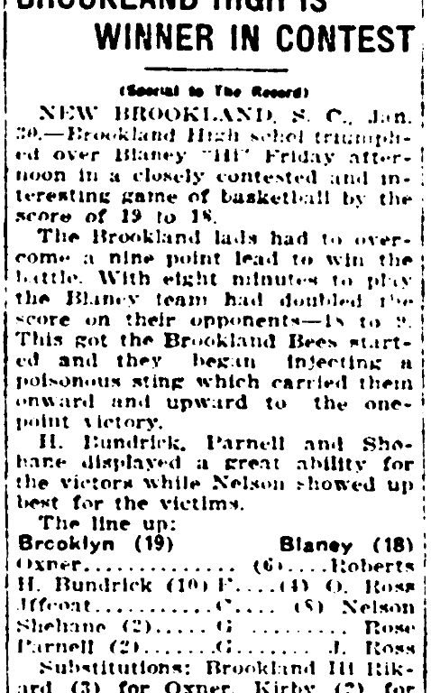 NEW BROOKLAND, S. C., Jan 30. Brookland High school triumphed over Blaney “Hi” Friday afternoon in a closely contested and interesting game of baskelll by the score of 19 to 18.