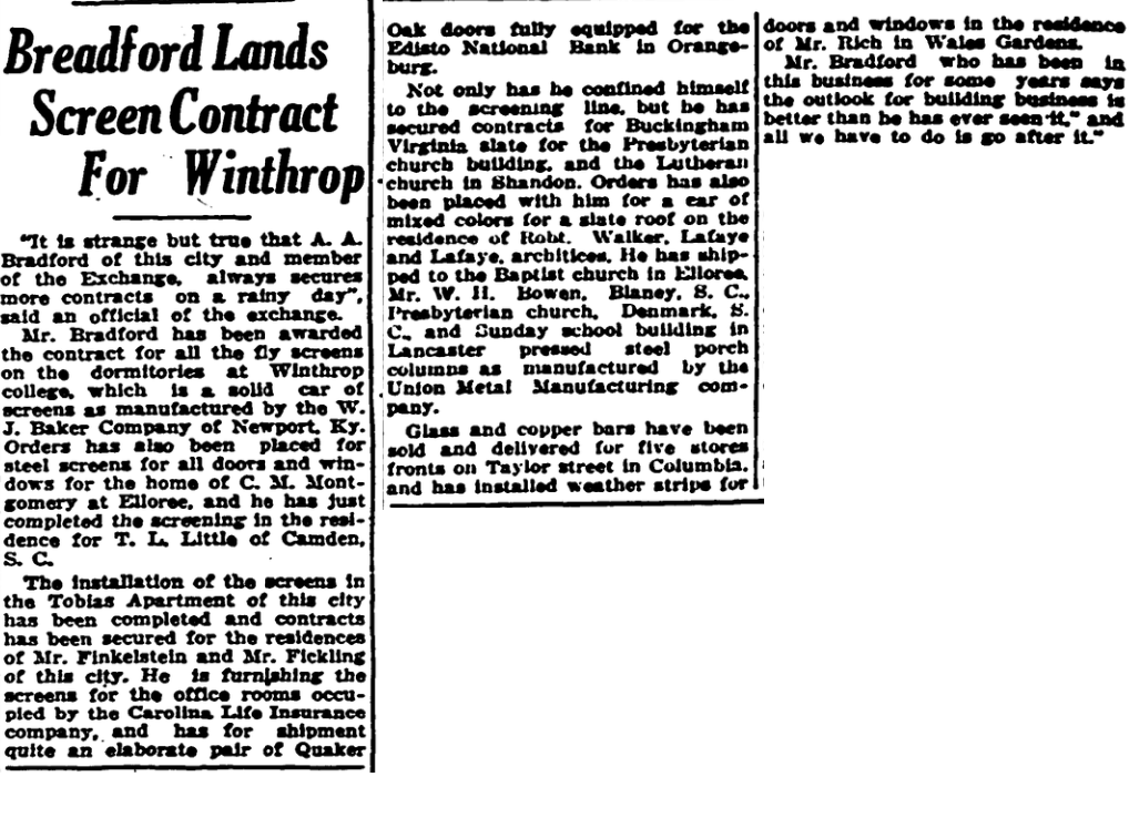 Mr. Bradford has been awarded the contract for all the fly screens on the dormitories at Winthrop college, which is a solid car of screens as manufactured by the W. J. Baker Company of Newport, Ky. Orders has also been placed for steel screens for all doors and windows for the home of C. M. Montgomery at Elloree, and he has just completed the screening in the residence for T. L. Little of Camden, S. C.