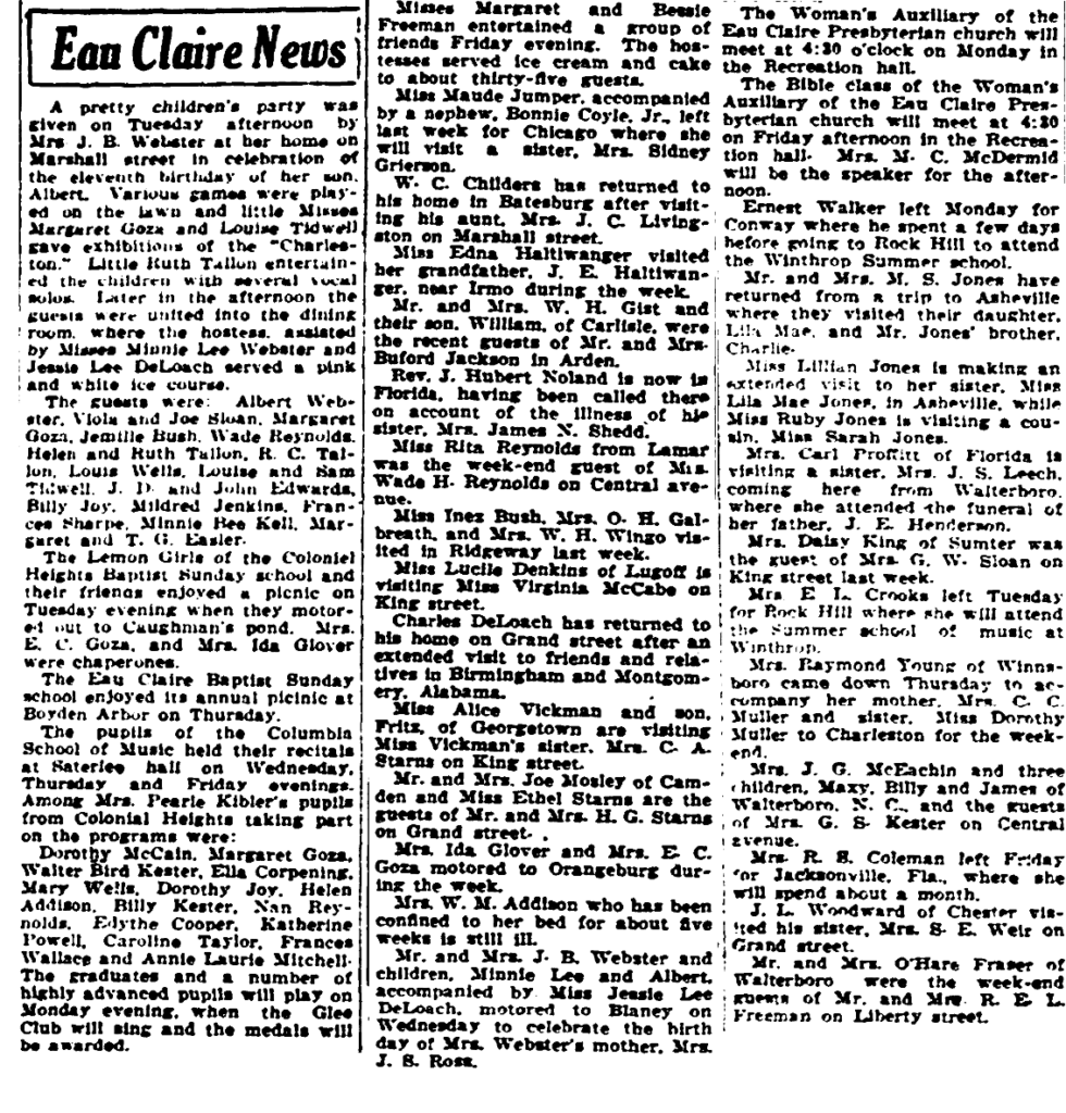 A pretty children’s party was given on Tuesday afternoon by Mrs. J. B. Webster at her home on Marshall street in celebration of the eleventh birthday of her son, Albert. Various games were played on the lawn and little Misses Margaret Goza and Louise Tidwell gave exhibitions of the “Charleston.” Little Ruth Tallon entertained the children with several vocal solos. Later in the afternoon the guest were united into the dining room, where the hostess, assisted by Misses Minnie Lee Webster and Jessie Lee DeLoach served a pink and white ice course.