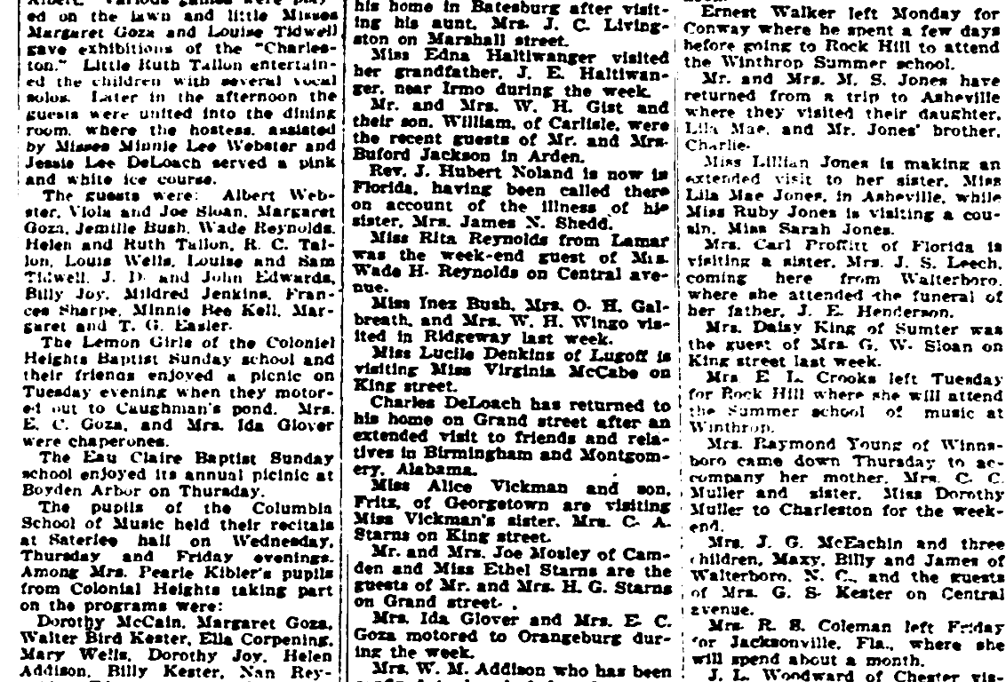 The Lemon Girls of the Colonial Heights Baptist Sunday school and their friends enjoyed a picnic on Tuesday evening when they motored out to Caughman’s pond. Mrs. E. C. Goza, and Mrs. Ida Glover were chaperones.