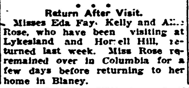 Return After Visit Misses Eda Fay, Kelly Rose and Allie Rose, who have been visiting at Lykesland and Horrell Hill, returned last week. Miss Rose remained over in Columbia for a few days before returning to her home in Blaney. Continue reading Gossip of Society and Women’s Clubs