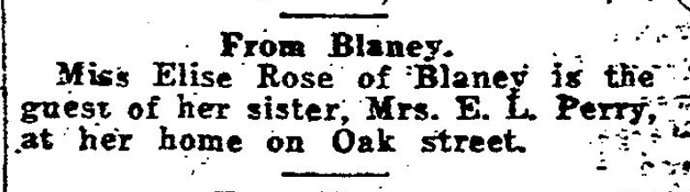 From Blaney Miss Elise Rose of Blaney is the guest of her sister, Mrs. E. L. Perry, at her home on Oak street. Continue reading Waverly News