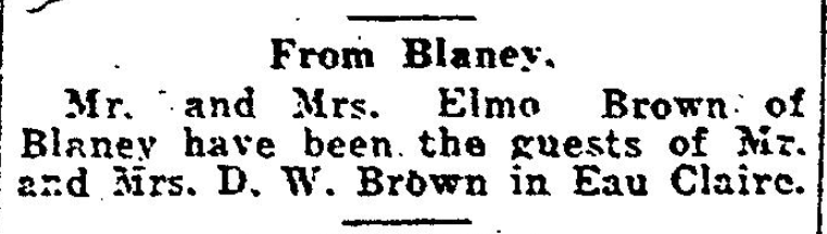 From Blaney Mr. and Mrs. Elmo Brown of Blaney have been the guest of Mr. and Mrs. D. W. Brown in Eau Claire. Continue reading In Eau Claire and Arden