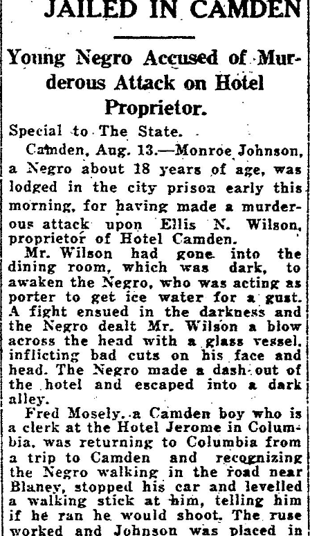 Young Negro Accused of Murderous Attack on Hotel Proprietor. Special to The State. Camden, Aug. 13 – Monroe Johnson, a negro about 18 years of age, was lodged in the city prison early this morning, for having made a murderous attack upon Ellis N. Wilson, proprietor of Hotel Camden. Mr. Wilson had gone into the dining room, which was dark, to awaken the Negro, who … Continue reading Monroe Johnson Jailed In Camden